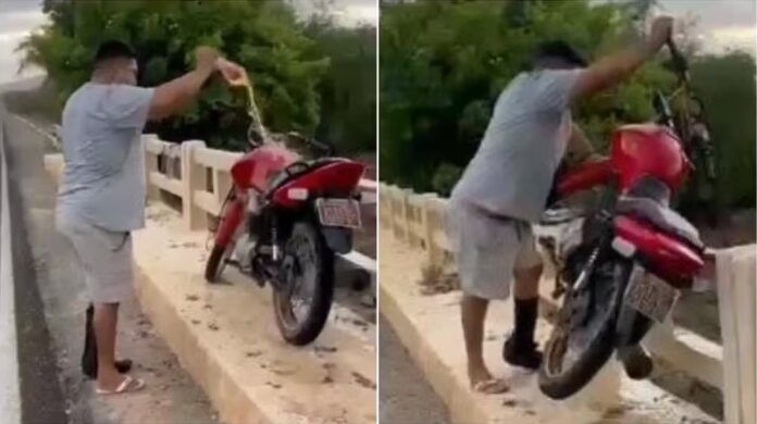 Dias antes de ser morto, homem despejou gasolina na moto de um desafeto e jogou o veículo em rio. — Foto: Reprodução