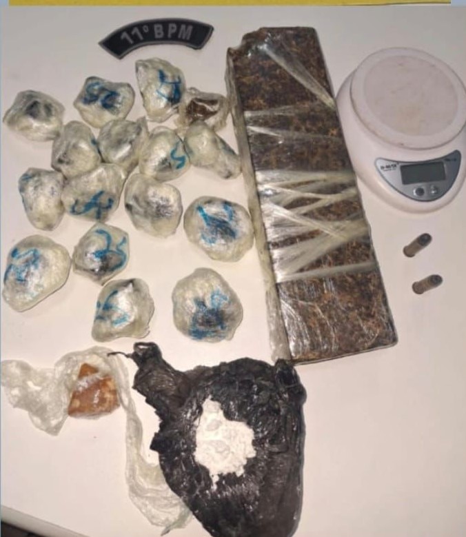 Durante a varredura no quintal, os militares perceberam forte odor de maconha e localizaram duas munições. Próximo dali, foi encontrada grande quantidade de maconha, além de porções de cocaína e crack enterradas no terreno.