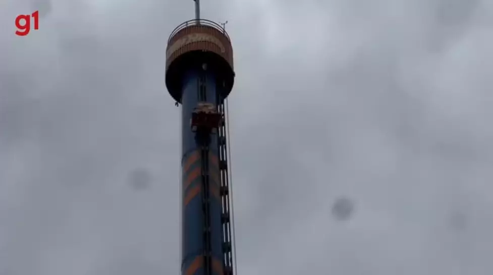 As imagens mostram o momento em que as demais cadeiras da torre descem normalmente, enquanto a que levava a família permanece parada a cerca de 100 metros de altura.