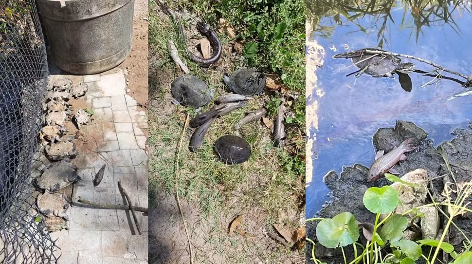 Ela contou que, com a ajuda dos outros moradores, conseguiu resgatar 14 cágados do canal, mas apenas nove ficaram vivos. A mulher disse, ainda, que dois biólogos, trazidos por um carro da Aena, foram ao local e recolheram alguns dos animais.