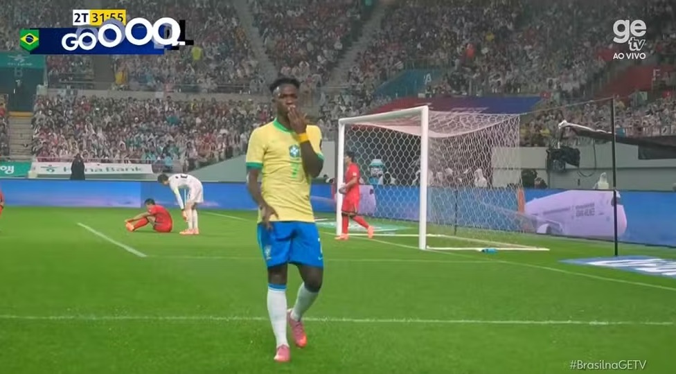 Após o pedido público de desculpas de Vini Jr. para Virginia Fonseca repercutir aqui e até na imprensa internacional, o craque marcou um golaço na partida da Seleção Brasileira contra a Coreia do Sul na manhã desta sexta-feira (10) e mandou um beijo para câmera.